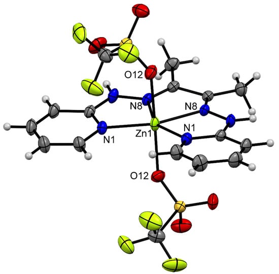 Ellipsoidal representation of [Zn(LH2)(OTf)2] (4) showing 50% thermal ellipsoids. Selected bond lengths [Å] and angles [°]: Zn(1)-N(1) = 2.0445(15), Zn(1)-N(8) = 2.1052(16), Zn(1)-O(12) = 2.2535(14), N(1)-Zn(1)-N(1)#1 = 131.48(10), O(12)-Zn(1)-O(12)#1 = 178.26(8).
