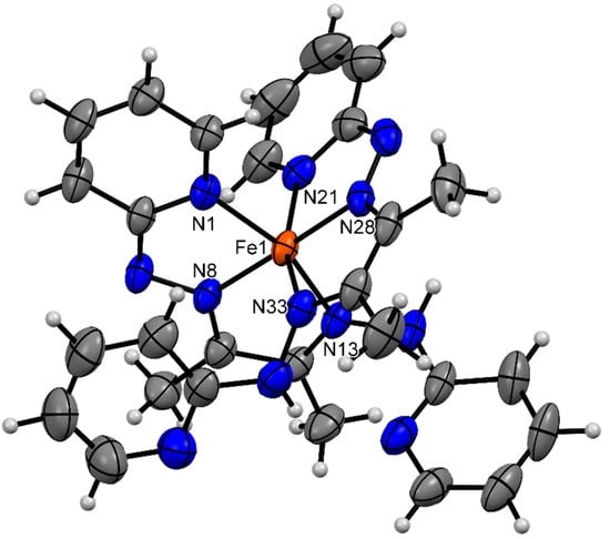 In the iron(II) crystal structure, the ligand underwent NH deprotonation on one side followed by the iron coordination with three nitrogen atoms (two imine nitrogen and one pyridine nitrogen atom). The coordination sphere of the iron center is completed with a second equally monodeprotonated ligand (Figure 7).
