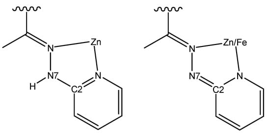 A great interest has been devoted towards the coordination chemistry of first-row transition metal complexes containing organic chelating ligands. Particularly, coordination complexes play a significant role in numerous biological functions, which has led to intensive studies in the field of bioinorganic chemistry [1,2,3]. Coordination compounds are fundamental in biological systems such as energy storage, oxygen transport, the proper functioning of different enzymes, electron transfer, and selective oxidation of carbon–hydrogen bonds, nitrogen fixation, and photosynthesis [4,5,6]. Over the past two decades, tremendous efforts have been devoted to the development of various types of supporting ligands and their metal complexes in order to model and mimic the biological systems. Iron and zinc have been found in the active sites of metalloenzymes; they catalyze a wide range of chemical reactions. Specifically, the chemistry of mono and binuclear iron(II) and zinc(II) metal complexes has aroused considerable interest in their use as model complexes as well as their biomedical applications [7,8,9,10,11,12].