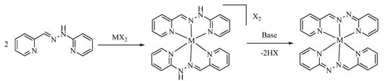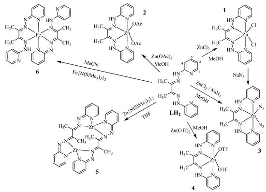 The neutral N4-tetradentate ligand LH2 was prepared according to a procedure described in the literature [41,42] by employing the condensation reaction of two equivalents of 2-hydrazinopyridine and one equivalent of 2,3-butanedione. The prepared ligand LH2 was characterized by NMR and ESI-MS. The subsequent reactions between LH2 and the metal salts are shown in Scheme 2.