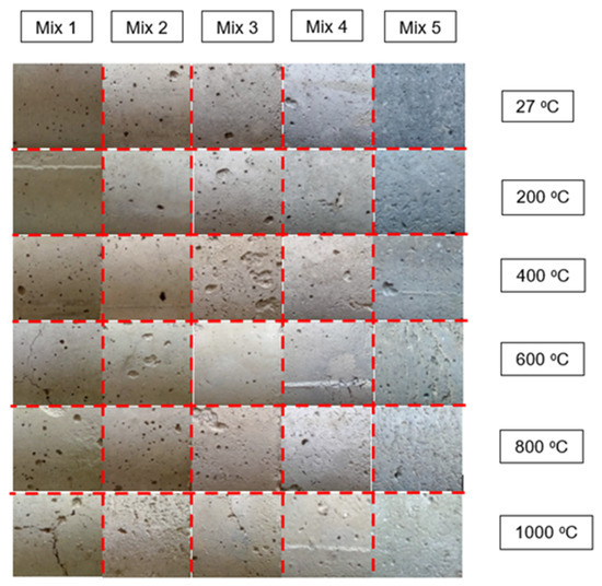 Generally, light pink colouration was observed on the surface of the samples with 100% natural sand aggregate when heated to above 600 °C, whereas the samples with 100% OPBC aggregate did not show any colour changes to pink. The sand aggregate started to experience a material reaction and subsequently caused pressure and chemical structure changes [47,48]. After the heat exposure to 600 °C, the natural sand material became light pink in colour. A similar colour change was observed in the mortars (M1–M4) containing natural sand aggregate. The visual determination of surface colour for M5 containing 100% OPBC aggregate showed a colour change from dark grey to light grey when heated from the ambient temperature to 1000 °C. Slight changes and differences in the lightness of the grey colouration were observed as the temperature increased. However, at the temperature between 600 °C and 800 °C, minimal colour change differences were determined. Therefore, the mortar samples began undergoing colour changes at 600 °C.
