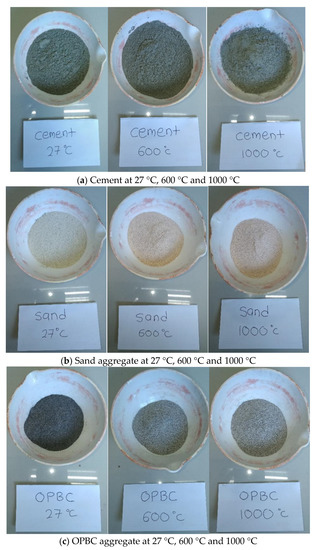 Moreover, the colour changes of constituent materials inside the mortar samples were studied. Figure 4 illustrates the colour changes of the OPC materials, natural sand, and OPBC aggregates at ambient temperature, 600 °C, and 1000 °C. From the ambient temperature to 1000 °C, the OPC powder experienced colour changes from light grey to dark grey, as shown in Figure 4a. Owing to the high temperature, the mineral compound inside OPC oxidised during heat reactions [48,49]. Figure 4b depicts the colour changes of sand aggregates from pale orange to pink. The possible reason behind the colour changes of sand aggregates at the temperatures of 600 °C and 1000 °C was the loss of moisture content within the pore space, leading to the dehydration of iron deposits from goethite to hematite [50]. As observed in Figure 4c, the OPBC aggregate changed from blackish to pale grey at 600 °C. Later, as the temperature increased to 1000 °C, the OPBC aggregate changed its colour from pale grey to light grey. This reaction occurred due to the iron ion that was activated whilst reducing the carbon ion content. Iron is usually perceived as dull and grey.