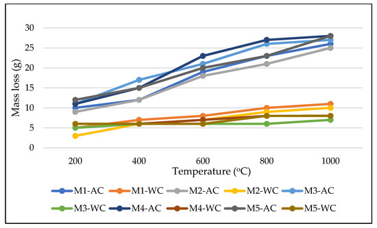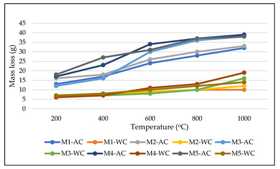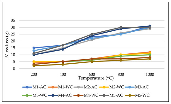 Mass loss of air-cured samples at elevated temperatures (where AC is air cooling, and WC is water cooling).