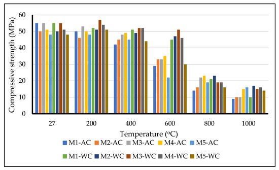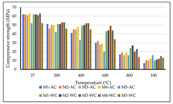 Compressive strength of air-cured samples at elevated temperatures (where AC is air cooling, and WC is water cooling).