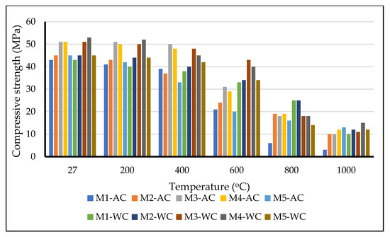Figure 8, Figure 9 and Figure 10 show the compressive strength variation of samples with different percentages of OPBC cured in three different curing conditions exposed to elevated temperatures followed by cooling under air and water. A significant increase in the compressive strength of the OPBC samples cured in full water and air was observed as the temperature increased to up to 200 °C. This increase indicated that the OPBC mortars could resist a temperature of up to 200 °C without any deterioration in strength. This statement is strongly supported by the findings of Karim et al. [37], who determined that the compressive strength of OPBC mortars increased with rising temperatures up to 300 °C. The small reduction in the compressive strength of the samples in all of the curing conditions could be attributed to the removal of free water during the heating process. As mentioned by other researchers, the thermal effect at this temperature causes water migration [37,51,52]. As observed in partial-water-cured samples, the percentage reductions in compressive strength for the M1, M2, M3, M4, and M5 samples were approximately 18%, 26%, 18%, 21%, 19% and 18%, 18%, 13%, 16%, 12% for the AC and WC conditions, respectively.