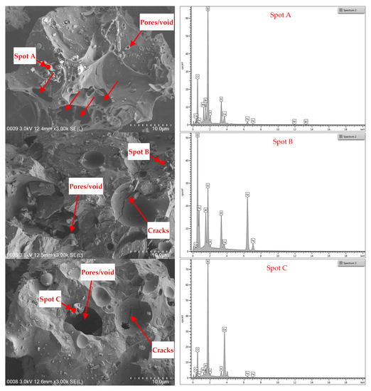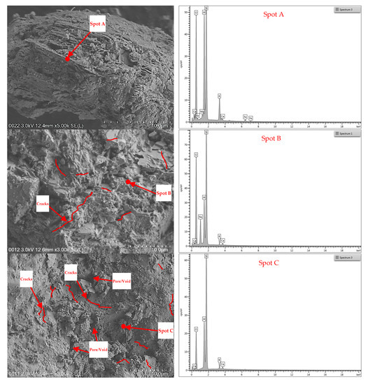Figure 13 (bottom row) shows the FESEM images and EDX analysis of the chemical compositions of sand exposed to the extreme temperature of 1000 °C. After exposure to the temperature of 600 °C, the microstructure of the sand was observed to be a clear surface without any irregular or angular shapes. This phenomenon represented a weak structural formation due to the high porosity that resulted from the high degree of heat exposure. These observations of microcracks, porosity, and microstructure correlated well with the compressive strength test results. The EDX analysis traced the spot marked as Spot C in Figure 13 (bottom row) and detected silicon and aluminium as main elements and small amounts of calcium and potassium.