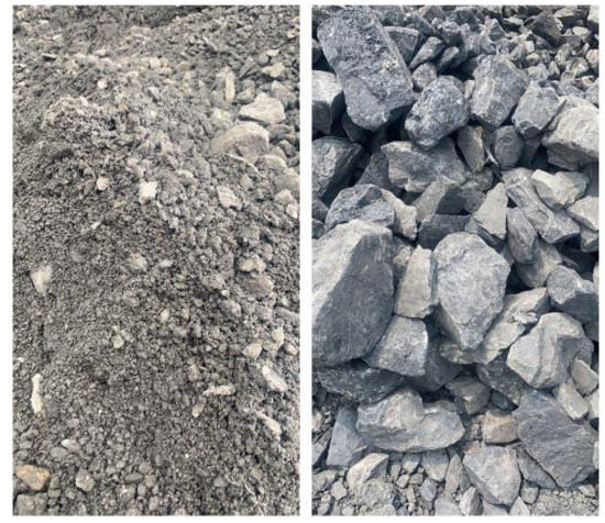 The undisturbed coal gangue used in the test was provided by Hongchang Building Materials Co., Ltd. in Hebi City, Henan Province. The reserves of coal gangue in Hebi City are more than 20 million tons, and these are persistently accumulating. The undisturbed coal gangue was screened in the mining area, and the coal gangue with a particle size less than 30 mm was separated (Figure 1). The coal gangue with a particle size greater than 30 mm was selected for crushing and classification. In order to ensure the particle size of coal gangue, an impact crusher was used for crushing (Figure 2), and the particles greater than 30 mm were crushed and sieved. According to the particle size distribution of coal gangue, it was divided into four grades: machine-made sand, 4.75–9.5 mm, 9.5–19 mm, and 19–31.5 mm, as shown in Figure 3.