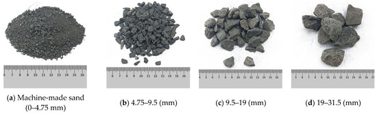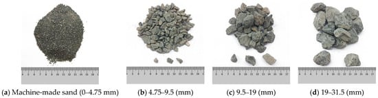 The gravel and machine-made sand used in the test were provided by Hongchang Building Materials Co., Ltd. in Hebi City, Henan Province. Based on the gradation/particle size distribution, the gravel and sand were classified into four grades (machine-made sand, 4.75–9.5 mm gravel, 9.5–19 mm gravel, and 19–1.5 mm gravel), as shown in Figure 5.