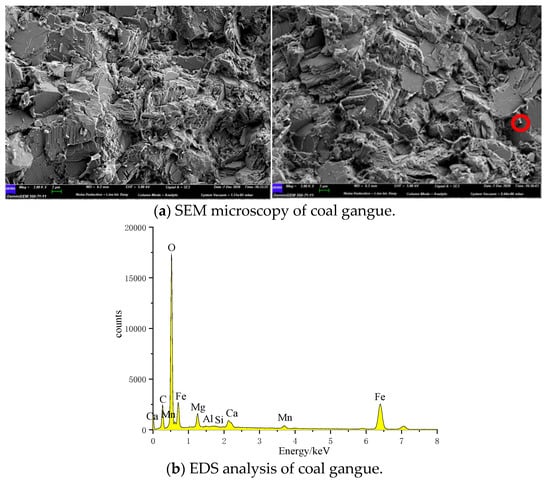 The results of the scanning electron microscope (SEM), energy dispersive X-ray spectroscopy (EDS) analysis, and X-ray diffraction (XRD) analysis are shown in Figure 6. Its chemical composition and physical and mechanical properties are shown in Table 4, Table 5 and Table 6. It can be seen that its basic physical and mechanical properties can meet the requirements for the class II highway base and subbase in the Chinese standard JTG/TF20-2015 “Technical guidelines for construction of highway roadbases” [37].