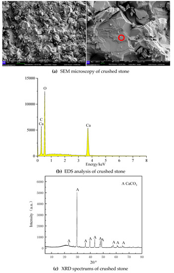 Gemini300 field emission scanning electron microscope (manufacturer: Carl Zeiss, Germany) was used to inspect the surface structure of concrete samples; Bruker D8 Advance X-ray diffractometer (manufacturer: Brooke Company, Germany) was used for X-ray diffraction analysis, and XRD data were analyzed with jade 6 software; The element distribution in the micro region of the material was analyzed qualitatively and quantitatively by SYMMETRYS EBSD energy chromatograph (manufacturer: Oxford Company, UK).The results of the scanning electron microscope (SEM), energy-dispersive X-ray spectroscopy (EDS) analysis, and X-ray diffraction (XRD) analysis are shown in Figure 4. The chemical composition and other physical and mechanical properties are shown in Table 1, Table 2 and Table 3. It can be seen that the basic physical and mechanical properties met the requirements for the class II highway base and subbase in the Chinese standard JTG/TF20-2015 “Technical guidelines for construction of highway roadbases” [37].