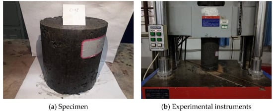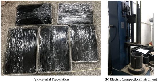 According to the compaction test results, the maximum dry density and optimum moisture content of cement stabilized gangue and cement stabilized macadam with different cement contents were determined. The specimens were formed according to the compaction degree of 96%. According to JTG E51-2009 “Test methods of materials stabilized with inorganic binders for highway engineering” [36], the unconfined compressive strength test of cement stabilized coal gangue and cement stabilized macadam was carried out for seven days. The static pressure was applied by the press, and 13 specimens (of size 150 mm × Φ150 mm) for each group were formed. After demolding, the specimens were cured in the standard curing room for seven days. On the last day of the curing period, the specimens were soaked in water for 24 h, and then the surface moisture was removed for subsequent testing of 7-day unconfined compressive strength (Figure 8).