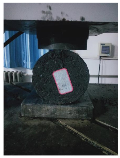 According to JTG E51-2009 “Test methods of materials stabilized with inorganic binders for highway engineering” [36], the splitting tensile test was carried out on cement stabilized gangue with a cement content of 3%, 4%, and 5%. Thirteen specimens (of size 150 mm × Φ150 mm) in total were prepared. After demolding, the standard curing was carried out for 90 days according to the method of T0845-2009 [36]. During the test, the loading rate of the press was controlled at 1 mm/min. The splitting tensile test process is shown in Figure 9.