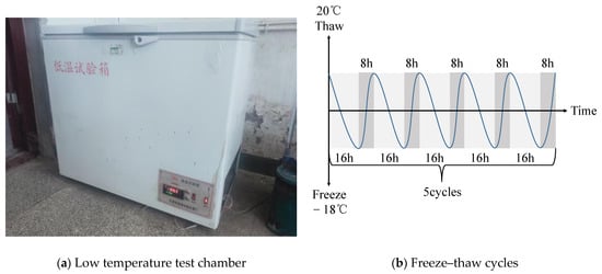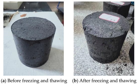 According to JTG E51-2009 “Test methods of materials stabilized with inorganic binders for highway engineering” [36], the freeze–thaw tests of cement stabilized gangue and cement stabilized macadam with a cement content of 4%, 5%, 6%, and 7% were carried out, respectively. Each group was statically pressed with a press to form 13 specimens (of size 150 mm × Φ150 mm). After demolding and marking, the specimens were put into a low-temperature chamber and frozen at −18 °C for 16 h. After freezing for one cycle, they were weighed, and each was melted in a 20 °C water tank for 8 h. After melting, the surface of the specimen was dried, and the sample was weighed again. The above freezing and thawing cycles were repeated until five freeze–thaw cycles were completed, and the unconfined compressive strength was measured. The process of the freeze–thaw test and the appearance of specimens before and after freeze–thaw are shown in Figure 10 and Figure 11, respectively.