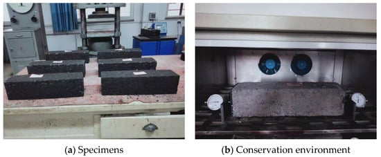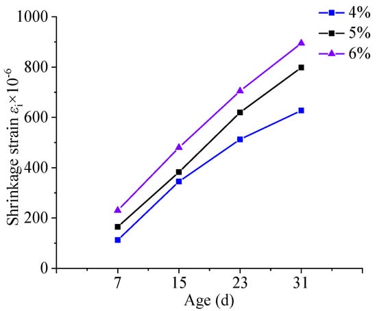 According to JTG E51-2009 “Test methods of materials stabilized with inorganic binders for highway engineering” [36], drying shrinkage tests were carried out on cement stabilized gangue with a cement content of 4%, 5%, and 6% (Figure 12). The mixture was prepared with the best moisture content obtained in the experiment, and the specimen was formed according to the compaction degree of 96%. The static pressure method was used to form the mixture, the speed was 2 kN/s, and the specimen size was 100 mm × 100 mm × 400 mm per beam. Each group had six specimens, out of which three specimens were used to measure the shrinkage deformation while the other three specimens were used to measure the drying shrinkage water loss ratio. The data was recorded every day during the first seven days and after every two days after 7-day age for 31 days.