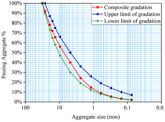 First, the raw materials of coal gangue with different particle sizes were sieved. The sieving/screening results are shown in Table 8. According to Appendix A of JTG/TF20-2015 “Technical guidelines for construction of highway roadbases” [37], the gradation design of inorganic binder stabilized material was optimized. Three control points were selected: a nominal maximum particle size of 31.5 mm with a passing rate of 100%, a particle size of 4.75 mm with a passing rate of 40%, and a particle size of 0.075 mm with a passing rate of 2%. The power function model y = axb was used to construct the gradation curve of coal gangue. Three control points were brought into the formula of power function model as follows: