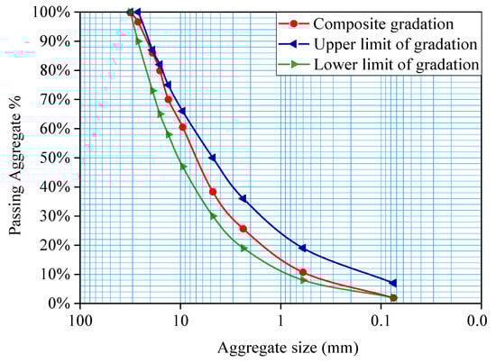 Firstly, the raw materials of coal gangue and crushed stone with different particle sizes were sieved to determine the gradation curve. Further, the gradation of coal gangue was optimized according to JTG/TF20-2015 “Technical guidelines for construction of highway roadbases” [37] to meet the gradation requirements for a secondary highway base and subbase. The gravel was screened and synthesized to meet the standard gradation based on the original four particle size ranges.