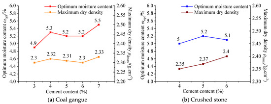 The maximum dry density and optimum moisture content of cement stabilized gangue cement stabilized macadam with different cement contents are shown in Figure 15. It can be seen from Figure 15a that the maximum dry density and optimal moisture content of cement stabilized coal gangue increased with the increase in cement content, and the change range is small. When the cement content was 7%, the maximum dry density and optimum moisture content of cement stabilized gangue were the highest, while with 3% cement content, these were the minimum. Compared with Figure 15a,b, under the condition of the same cement content, the maximum dry density of cement stabilized macadam was higher. The optimum moisture content was smaller than that of cement stabilized gangue.