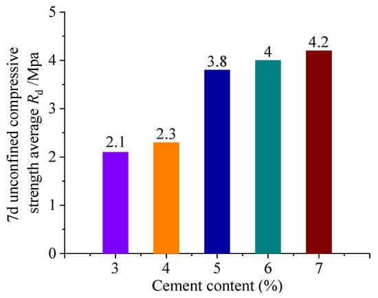 The representative value of 7-day unconfined compressive strength of cement stabilized macadam with 4% cement content was Rd = 4.0 MPa. The representative values of the 7-day unconfined compressive strength of cement stabilized gangue with different cement contents are shown in Figure 16. It is clear from Figure 16 that the representative value of unconfined compressive strength of cement stabilized gangue with 4% cement content was about 57.5% of the cement stabilized macadam with the same cement content. Compared with the 7-day unconfined compressive strength of 3% cement stabilized gangue, the 7-day unconfined compressive strength of cement stabilized gangue with 4%, 5%, 6%, and 7% cement increased by 0.2 MPa, 1.7 MPa, 1.9 MPa, and 2.1 MPa, respectively. Reasons may be that with the increase in cement content, the pores around the specimen are correspondingly reduced, which can make the structural shape more dense, so as to increase the strength of cement stabilized coal gangue [38]. The 7-day unconfined compressive strength of 7% cement stabilized gangue was higher than that of the 4% cement stabilized macadam. It can be seen from Figure 16 and Table 11 that when the cement content is the same, the 7-day test results of cement stabilized coal gangue in this paper were higher than those of other researchers in Table 11. In this paper, the 7-day unconfined compressive strength of cement stabilized coal gangue with 3% and 4% cement content can meet the requirements for a medium and light traffic base (2.0–4.0 MPa) and a heavy traffic subbase (2.0–4.0 MPa) of class II and below highways, respectively; other researchers needed the cement content of cement stabilized coal gangue to reach 5% or 6%, respectively.