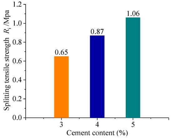The representative values of the 90-day splitting tensile strength of cement stabilized gangue with different cement contents are shown in Figure 17. It can be seen that the 90-day splitting tensile strength values of cement stabilized coal gangue with 3%, 4%, and 5% content were 0.65 MPa, 0.87 MPa, and 1.06 MPa. Compared with the 90-day splitting tensile strength of 3% cement stabilized gangue, the 7-day unconfined compressive strength of cement stabilized gangue with 4% and 5% cement increased by 0.22 MPa and 0.41 MPa, respectively. The results also indicated that the 90-day splitting tensile strength of cement stabilized coal gangue increased with cement content, and showed the same change law as the unrestricted compressive strength. The splitting tensile strength mainly reflects the cementing ability of cement stabilized aggregate inside aggregate. It mainly depends on the cohesion between aggregates. The C–S–H gel after hydration of cement is the source of this cohesive force [40]. Therefore, an increase in cement content can improve the splitting tensile strength of cement stabilized coal gangue.