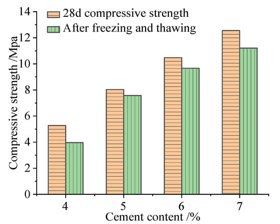 Table 12 and Figure 18 show the frost resistance index and freeze-thaw compressive strength loss diagram of cement stabilized gangue with 4%, 5%, 6%, and 7% cement content. It can be seen from these results that the compressive strength loss BDR of the cement stabilized coal gangue with cement contents of 4%, 5%, 6% and 7% were greater than 75% after five freeze-thaw cycles, and the mass loss rate was less than 1%. Its compressive strength loss BDR was greater than the frost resistance requirements of lime fly ash stabilized materials in the heavy freezing area of Expressway and class I Highway (70%) [44], and the mass loss rate was less than the specification requirements (5%) [36]. The compressive strength loss of the cement stabilized gangue with 5% and 6% cement was the least, followed by the cement stabilized gangue with 7% cement which had a higher loss in compressive strength after freeze-thaw cycles. The compressive strength loss with 4% cement content was the highest. Reasons may be that the cement stabilized coal gangue with a cement content of 4% has a large number of pores due to the small cement content, and due to its high water content, the volume expansion of the water in the pores during the freezing process is large, which destroys the original pore structure and produces microcracks, resulting in greater strength loss than the other three cement contents [38]. Therefore, the cement content and moisture content are the main factors affecting the compressive strength loss of the cement stabilized coal gangue after freeze-thaw cycles.