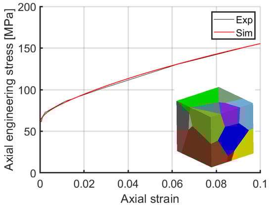 The single crystal model parameters were fitted with available experimental data curves from Reference [24] at 75 °C, first using a simplified 3D microstructural aggregate with a small amount of grains with random orientation for computational efficiency. The small 3D RVE does not have a sufficient amount of grains or orientations for a representative fit. Therefore the parameters were verified with realistic grain structures in Section 3.3. Figure 1 shows simulated and experimental stress–strain curves after parameter identification. Table 1 lists the simulation parameters for the model.