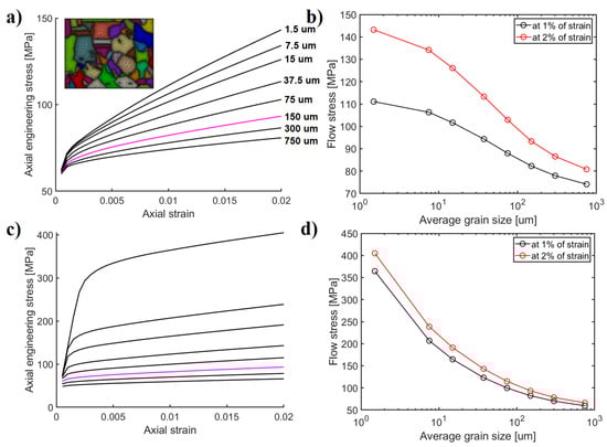 (a) Stress–strain curves for different grain sizes without Hall-Petch offset, (b) flow stress values at constant strains for different grain sizes, (c) stress–strain curves for different grain sizes with Hall-Petch offset, and (d) flow stress values at constant strains for different grain sizes using Hall-Petch offset. The computational RVE shown in (a) is used for all cases; it is scaled to achieve the specific grain sizes.