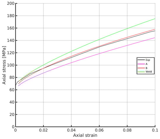 For the A and B cases, we assumed the same average initial grain size of 150 m and for the friction stir welded zone 102 m was used. This choice affects the initial Hall-Petch yield offset in the stress–strain curves. Figure 3 shows the stress–strain response of the microstructure cases. It can be seen that the Hall-Petch offset associated differences appear relatively small because the average initial grain size does not have such high variation. The simulated stress–strain curves of microstructure B describe the experimentally obtained strain hardening behavior well.