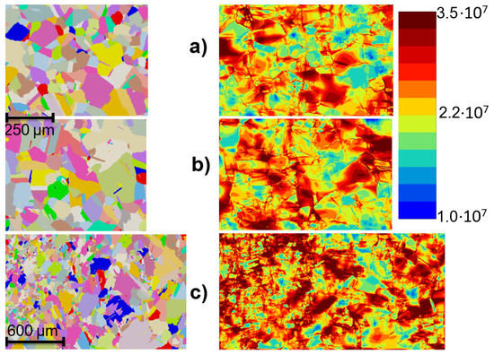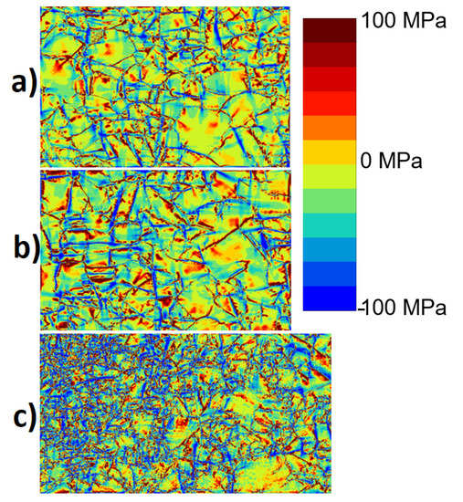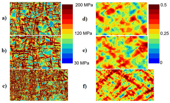 Figure 6 illustrates the distribution of the generalized stress term . Recall that is introduced in Equation (2) which affects slip resistance. It is possible that , and therefore we adopt the restriction that following [18]. It can be observed that the hardening effect of is stronger for the microstructure B than A. It should be noted that blue colour (negative sign) produces extra hardening in Figure 6 with respect to Equation (2). The most significant effect is found near the grain boundaries for larger grains, as expected, while smaller grains in Figure 6c show a pronounced hardening effect also towards the grain interiors at the fine grained sections of the microstructure. This length-scale dependent model characteristic elevates von Mises stresses as seen in Figure 5.