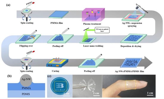 Silver nanowires (Ag-NWs) have attracted considerable attention as FTE materials owing to their good electrical conductivity, high transparency in the visible band, excellent ductility, and facile fabrication process [19]. In particular, the conductive networks formed by ultralong metallic nanofibers have shown promise for application to FTEs because of their superior optical, electrical, and mechanical properties [20,21]. A variety of electronic components with Ag-NW FTEs were fabricated in previous studies, including flexible and transparent antennas [22], wireless circuits [23], transistors [24], and sensors [25], demonstrating the potential applications in wearable devices. However, the contact resistance between Ag-NWs and adhesion to the organic substrates have presented two major challenges for high-performance FTEs. Methods for the improvement of contact resistances have been sophisticatedly presented in previous works. Thermal annealing has received the most attention due to its facile fabrication process and high welding quality. However, thermal annealing requires an oxygen-free environment due to the high chemical reactivity of Ag-NWs at high temperature. Moreover, thermal annealing is not suitable for the flexible organic substrates due to the low melting temperature of organic materials. Consequently, a low-temperature thermal annealing (below 200 °C) was developed [26]. Other physical welding methods employing force, electricity, light, etc. were also developed to realize Ag-NW network welding without significant thermal effects for FTEs [27,28,29,30,31,32,33,34,35]. Although high-pressure welding optimized the conductivity of the Ag-NW FTEs down to 8.4 Ω/sq, the substrates and other layers could be destroyed [27]. To solve this problem, Liu et al. proposed a capillary-force-induced cold-welding technique in which the moisture-treated Ag-NWs exhibited a significant reduction in sheet resistance (~37 Ω/sq) due to the giant capillary forces exerted between Ag-NWs [28]. Unfortunately, the poor adhesion of Ag-NWs on the substrate has not been improved. Another method that has been used is electric welding; it is based on the high contact resistance at the junction of Ag-NWs, where Joule heating caused by the application of bias voltages results in localized melting, welding the Ag-NWs [29]. The main drawback of this method is the non-homogeneous current distribution due to the complex Ag-NW network, which proved unsuitable for large-area welding. Hong et al. achieved Ag-NW nano-welding by electron-beam irradiation, which provided sufficient energy to melt the Ag-NWs [30]. However, the required vacuum chamber and the high-cost instrument limited the method for industrial applications. Compared with electron beams, light is an ideal energy source to induce the nano-welding of Ag-NWs. Liang et al. employed ultraviolet A (UVA) light irradiation for Ag-NW nano-welding, reducing the sheet resistance by three orders of magnitude (down to 25 Ω/sq) with a good transparency (97%) [31]. The femtosecond pulsed laser (fs-pulsed laser) was also used to irradiate Ag-NWs, where the excited localized surface plasmon resonances (LSPRs) at the gaps between Ag-NWs generated a considerable enhancement of electric field strength, inducing local melting for nano-welding. Meanwhile, the polyethylene glycol terephthalate (PET) substrate was not damaged during the laser irradiation. The obtained sheet resistance and optical transmittance by fs-pulsed nano-welding were 16.1 Ω/sq and 91%, respectively [32]. Although nanosecond pulsed lasers (ns-pulsed lasers) were also tested for the nano-welding of Ag-NWs [33], most of the laser-irradiation methods were only suitable for inorganic and limited organic substrates with high melting temperatures and stiffnesses (glass, silica, PET, PVA), owing to the requirement of thermal endurance from laser energy input. Generally, the most used highly flexible and bio-compatible organic materials (e.g., polydimethylsiloxane, PDMS), possess low melting points and stiffnesses. Therefore, a nano-welding technique for junction-localized energy confinement that will not deteriorate the substrate is still lacking. In addition, the adhesion of Ag-NW networks to the organic substrate also needs to be resolved by jointing Ag-NWs with the substrate gently [9,10].