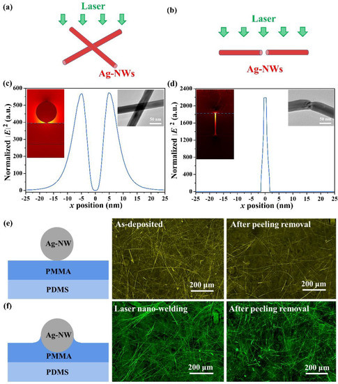 To further study the mechanism of laser nano-welding of the Ag-NWs on organic substrates, a numerical simulation of laser interaction with Ag-NWs was performed. Two typical structures of as-deposited Ag-NWs were considered, as illustrated in Figure 3a,b, including cross-junction and head-to-head configurations. It is well-acknowledged that the LSPRs in the vicinity of Ag-NWs can be excited by light with a wavelength of ~500 nm, by which the electromagnetic (EM) fields are significantly enhanced and localized around the Ag-NWs. Meanwhile, the Joule heating caused by ohmic energy loss resulted in melting for the nano-welding of Ag-NWs [36,37,38,39]. The electric fields in the two structures are shown in Figure 3c,d. It can be clearly observed that the electrical intensities were boosted in the gaps between Ag-NWs, where the enhancement ratios were 573.4 and 2193.2 for cross-junction and head-to-head structures, respectively. As a result, these regions were first melted under laser irradiation and connected, realizing Ag-NW welding. The electrical intensities far from these gaps were extremely low, preventing the deterioration of Ag-NWs. The numerical simulation was in agreement with the experimental results, revealing the mechanism of laser nano-welding of the Ag-NWs. Furthermore, selective nano-welding was conducive to Ag-NW network jointing with the PMMA. Owing to its low melting point (~200 °C), the PMMA film can be melted due to the high temperature at the Ag-NW welding regions, and the Ag-NW network was partially embedded into the organic film for good adhesion. To validate the hypothesis, a 3M low-adhesion tape was employed to press and remove the Ag-NWs from the FTEs, as shown in Figure 3e,f. The adhesion between Ag-NWs and PMMA was significantly strengthened after laser nano-welding, as shown by the slight reduction of Ag-NW quantity under removal cycles of over 100. This confirmed the jointing of the Ag-NW network and PMMA substrate by laser irradiation.