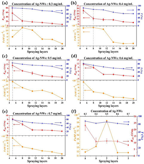 The criteria for high-quality FTEs consist of electrical conductivity and transmittance. The ideal FTEs should possess high conductivity, good transmittance, and durable flexibility. The transmittance was generally reduced as conductivity increased due to light scattering and absorption by the high concentration of Ag-NWs. Therefore, the balance between conductivity and transmittance should be maintained by optimizing the density of Ag-NWs on the PMMA film. The multiple-spraying strategy was therefore employed to control the density by two parameters, that is, the concentration of the Ag-NWs suspension and the number of spraying layers. To obtain a stable sheet resistance, the number of spraying layers was greater than five. Figure 4 shows the sheet resistances and transmittances of Ag-NWs/PMMA/PDMS FTEs under different suspension concentrations and spraying layers after laser nano-welding with 28.9 mJ/cm2 for 50 s. In Figure 4a–e, it can be clearly seen that the sheet resistance and transmittance were both decreased as the concentration and number of spraying layers increased. For the low concentration of 0.3 mg/mL, the sheet resistance was dramatically reduced when the number of spraying layers was eight, and then kept constant. Furthermore, the transmittance was linearly reduced from 89.9% to 63.4% as the number of spraying layers and concentration increased. The higher concentration could reduce the number of spraying layers down to five for the lowest sheet resistances. To evaluate the optimal performance in optical and electrical properties, the figure of merit (FoM) was employed as follows [40]: