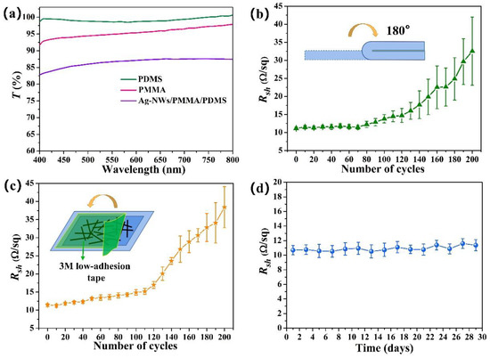 Figure 5a shows the transmittance spectra of PDMS, PMMA, and Ag-NWs/PMMA/PDMS FTEs in the visible band. Although the Ag-NWs slightly reduced the transmittance, the flat spectrum in the visible band indicated good transparency without wavelength selection, as shown in Figure 1c. The flexibility of Ag-NWs/PMMA/PDMS FTEs was examined by the fold-bending test. The fold-bending-induced strain (ε) was 75.6%, which was estimated by [41]