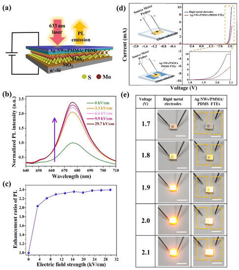 Applications of Ag-NWs/PMMA/PDMS FTEs. (a) Sandwich structure for gate-controlled PL emission from MoS2 monolayer. (b) PL spectra of MoS2 monolayer under various gate-voltage-induced electric field strengths. (c) Evaluation of PL enhancement ratio with electric field strength. (d) I–V curves of commercial LEDs with rigid metal electrodes and FTEs, where the insets demonstrate the experimental setups. (e) Photographs of luminescence from the LEDs under various bias voltages through different electrodes.