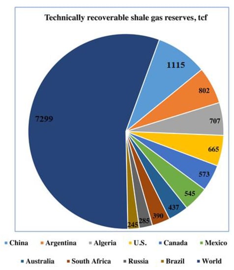 Global projection of technically recoverable shale gas reserves in trillion cubic feet (TCF). The leading global countries are shown in different colors. Reproduced with permission from [3] Copyright 2016 Elsevier.