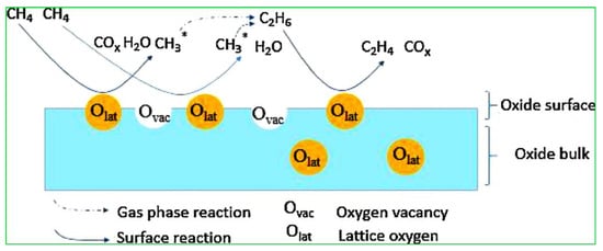 Diagrammatic representation of oxidative coupling of methane (OCM) reaction on a metal oxide catalyst surface. Reproduced with permission from [19]. Copyright 2018 Elsevier.