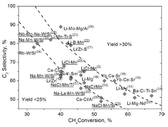 From the pioneering work of Keller and Bhasin [22] and Ito and Lunsford [23], various catalysts have been investigated to attain adequate methane conversion and C2 selectivity/yield. Most of the metal oxides in the periodic table, such as transition metal oxides, rare earth metal oxides, alkali or alkaline earth metal oxides, perovskites and pyrochlore compounds, have been individually or in various combinations tested for OCM reaction [3,24,25,26,27,28]. Zavyalova et al. [29] conducted a comprehensive statistical analysis of about ~1000 research articles related to OCM. They pointed out that both rare-earth metal oxides and alkaline-earth metal oxides, along with alkali metal oxides, are good candidates for OCM reaction. In addition, binary and ternary combinations of metal oxides are also crucial for high and sustainable catalytic activity in the OCM reaction. The selectivity of the catalysts can be further improved by using various dopants such as alkali (Cs, Na) and alkaline earth (Sr, Ba) metals, whereas Mn, W and the Cl− anion dopants can be used to enhance the catalytic activity. Figure 3 represents the most promising OCM catalytic systems with C2 yields greater than 25%.