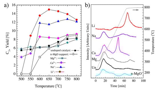 Elkins et al. [38] studied rare earth oxides (Sm2O3, TbOx, PrOy and CeO2) doped with alkali (Li and Na) and alkaline earth metal (Mg and Ca) supported on MgO. These metal dopants can alter the acid-base property of catalysts, which has an impact on catalysts activity, selectivity and stability. Hence, doped catalysts showed higher C2 yields than undoped catalysts owing to the presence of strong basic sites (see Figure 4). Among all catalysts, Li-TbOx/n-MgO showed better activity, C2 selectivity and C2 yield at 650 °C. However, undoped catalysts showed higher yield at a lower temperature (<600 °C) than the doped catalysts because the active sites in doped catalysts are blocked with by-product CO2 at low temperatures.