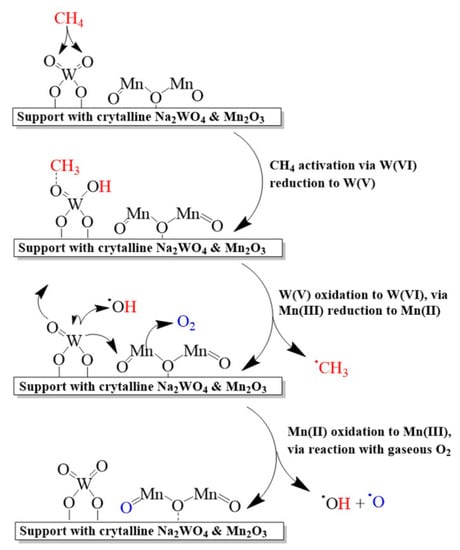 If the catalyst contains only Na or W-oxide, it is inactive and unselective. However, catalysts consisting only of Mn-oxide are quite active towards methane combustion. Na and W-oxide catalysts doping enhance their conversion and C2 selectivity, presumably due to synergy between Na and W components with structural effects and the introduction of surface basic sites. The addition of Na makes it easy to reduce the W-oxide component, which has a positive impact on OCM. Catalysts having both Mn and W oxides showed better C2 selectivity but were slightly less active. The bi-component system (Na and Mn oxide) is 100% selective but has poor conversion, while, the three-component system (Mn-Na-W oxide supported on SiO2) shows significantly higher selectivity than bi-component (Na-W, Na-Mn and, and Mn-W) catalysts, although it is slightly less active than the Na-W oxide catalyst. Each component has a specific role in the reaction, and the Na species are generally known to convert SiO2 support from its primary amorphous phase to crystalline SiO2 (α-cristobalite) phase, which plays an important role in the OCM reaction and also favors in the migration of Mn and W species to the surface of the catalyst [55,56,63]. The common role of Mn is promoting oxygen mobility between surface-adsorbed and lattice oxygen atoms. The surface Mn sites are responsible for OCM activity and C2 hydrocarbon selectivity [53]. OCM reaction mechanism for the supported Mn2O3/Na2WO4/SiO2 catalyst is shown in Figure 6.