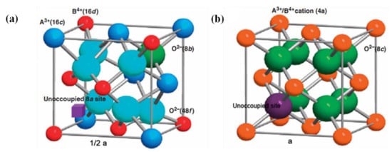 (a) Structure of pyrochlore (1/8 unit cell), (b) Structure defective fluorite. Reproduced with permission from [83].