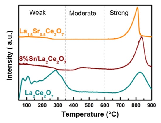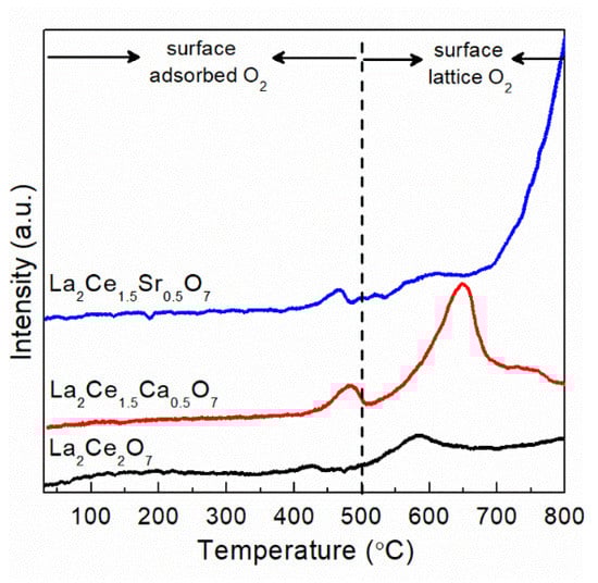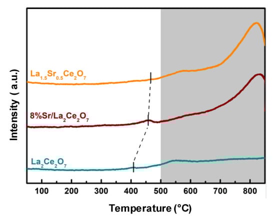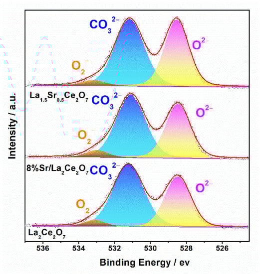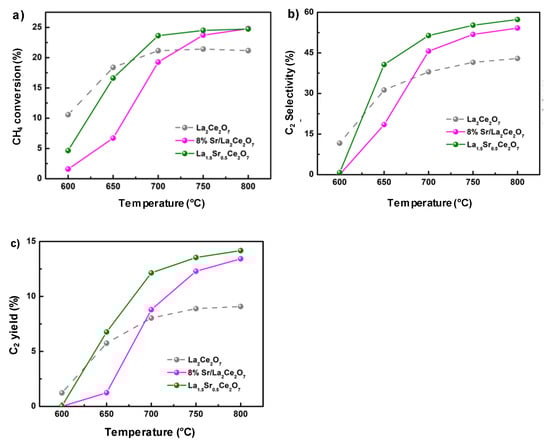 La2Ce2O7 pyrochlore catalysts have been synthesized in our group using the sol-gel method and further doped with Sr through optimization on Sr loading [89]. The defective cubic fluorite phase remained after Sr doping. Introduction of Sr in La2Ce2O7, especially allowing strontium to enter into the crystal lattice (La1.5Sr0.5Ce2O7), significantly improved the mobility of lattice oxygen compared to the undoped pyrochlore (La2Ce2O7) and impregnated Sr sample (8% Sr/La2Ce2O7) (Figure 8). The relative contents of O2− lattice oxygen of the three prepared catalysts, i.e., doped, impregnated and undoped, followed the order of La1.5Sr0.5Ce2O7 > 8% Sr/La2Ce2O7 > La2Ce2O7 as shown in XPS results (see Figure 9, Table 4); these obtained results were in line with H2-TPR results and the OCM reaction performance. A sample containing a large amount of lattice oxygen sites showed better reaction performance (see Figure 11). CO2-TPD results (see Figure 10, Table 5) revealed that introduction of Sr enhanced the ratio of strong basic sites, which is usually considered as a beneficial factor for producing C2 products. As a result, the selectivity and yield of C2-based products could reach 57% and 14%, respectively, over La1.5Sr0.5Ce2O7 catalysts at 800 °C (see Figure 11). Moreover, this catalyst showed stable catalytic performance up to 30 h without deactivation (see Figure 12).