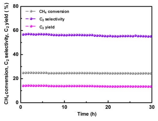 Stability test at 800 °C with the La1.5Sr0.5Ce2O7 catalyst. Reaction condition: CH4:O2:N2 = 4:1:5, WHSV = 72,000 mL·g−1·h−1 [89].