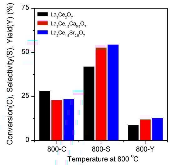 In another study, we substitute the B site of La2Ce2O7 by Ca2+ (0.1 nm) and Sr2+ (0.126 nm), respectively, which have an identical atomic radius to Ce4+ (0.097 nm). These catalysts showed better selectivity and yield than host compounds. XRD results (Figure 13) reveal that all doped samples presented well-resolved peaks analogous to their host pyrochlore materials with only a slight shift of the 2θ values, signifying those doped compounds have similar phase structures to their host compounds. The quantitative analysis of H2-TPR results (see Figure 14, Table 6) revealed that the reduction temperature and reducible lattice oxygen species of doped samples were significantly enhanced than the un-doped sample; consequently, this rise in the reduction temperature indicated higher M-O bonding strength. Among these doped catalysts, La2Ce1.5Sr0.5O7 showed a higher reduction temperature and contained a larger amount of lattice oxygen, which was primarily responsible for the higher C2 selectivity in the OCM reaction. Therefore, this catalyst exhibited better yield at 800 °C (see Figure 15).