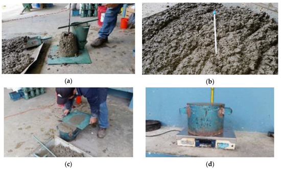 The temperature was determined according to the ASTM C 1064/C1064M-08 standard [50], which indicates that the concrete must be placed in a non-absorbent container with at least 75 mm of concrete in all directions from the temperature sensor, which must have a resolution of ±1.0 °C or smaller with an interval of 0 °C to 50 °C. The thermometer was submerged in fresh concrete to a minimum depth of 75 mm, leaving it for over 2 min until the reading was established (see Figure 1b). The unitary mixture was calculated according to the NMX-C-162-ONNCCE-2014 standard [51]; the equipment used for this test was a balance with a precision of 50 gr., maze of gum, ruler plate, verification plate, measuring container and compaction rod. The concrete was placed in three layers inside the container, and each one was compacted via 25 penetrations with the compaction rod. When compression was complete, the mold was made flush with the ruler plate; finally, the container with the compacted concrete was weighed (see Figure 1c,d).