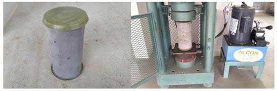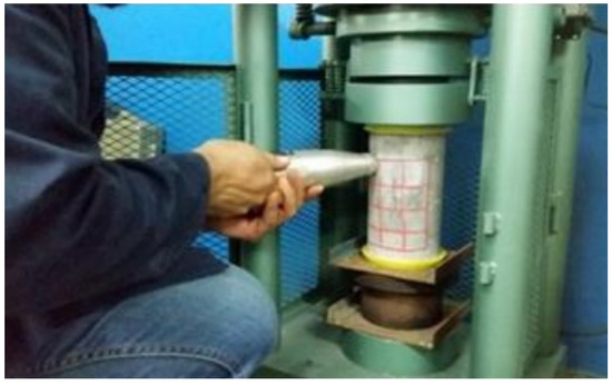 Compressive strength is the parameter or property of the mechanical behavior of hydraulic concrete most necessary for the structural design of civil infrastructure built on the basis of reinforced concrete. Compressive strength testing was carried out according to the NMX-C-083 ONNCCE standard [52], for which specimens were manufactured using cylindrical steel molds of 100 × 200 mm. After 24 h they were removed from the molds and placed in a curing tank according to the NMX-C-ONNCCE standard [53]. The specimens of the six study mixtures were tested at the ages of 7, 14, 28, 90 and 180 days using a loading rate of 0.3 MPa/s (see Figure 2). The compressive strength values analyzed in the results section are the average of the values of three specimens of each mix of concrete.