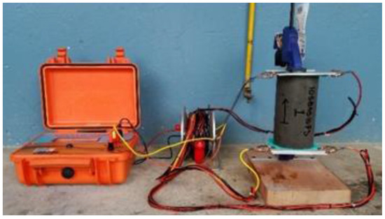 The electrical resistivity test was carried out according to the ASTM G57-07 standard [61], according to the specified equipment requirements and procedures for the measurement of resistivity in the laboratory and on site. The DURAR Network manual [62] indicates the criteria for interpretation of the resistivity results obtained and their relationship with the risk of corrosion of the reinforced concrete, which are presented in Table 4. The tests were carried out at 7, 14, 28, 90 and 180 days. Figure 4 shows the arrangement to carry out the electrical resistivity test.