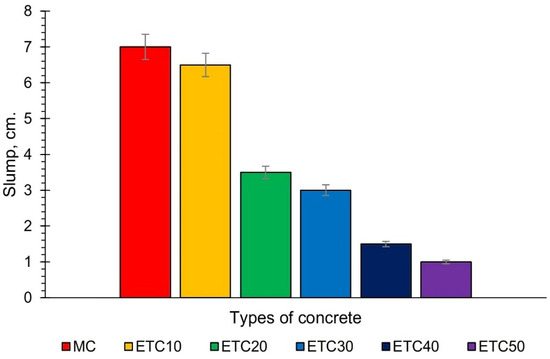 A decrease in workability or slump was observed in the five ETC mixtures; however, the ETC-10 mixture presented only a 7% decrease (0.5 cm) with respect to the control mixture (MC), with a value of 6.5 cm, which is considered an acceptable workability slump. With an increase to 20% in the percentage of substitution of CPC 30R with the combination of SCBA-SF, the slump showed a decrease of 50% (3.5 cm) with respect to the control mix (MC); this decrease in workability is attributed to the demand or absorption in excess of water due to pozzolanic materials [63,64], as is the case for SCBA and SF. For the ETC-30 mixture the slump was similar to that of the ETC-20 mixture, reaching a slump of 3 cm, which indicates a decrease of about 60% compared with the control mixture. In the case of the ETC-40 and ETC-50 mixtures, the effect of substituting CPC 30R by 40% and 50% respectively had a decisive effect in reducing the workability of these mixtures compared to the control mixture, with a decrease in slump of 80% for the ETC-40 mixture and 85% for the ETC-50. This behavior is due to excess water absorption by the supplementary materials used; therefore, in several investigations where concretes with large volumes of pozzolanic materials such as blast furnace slag or fly ash were used, water-reducing or super fluidizers additives were used to obtain slumps greater than 10 cm, which allowed adequate workability of the concrete mixtures [65,66].