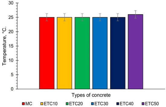 Figure 6 presents the behavior of the temperatures of the six studied concretes. It is observed that five mixtures presented a temperature of 25 °C and the ETC-50 mixture presented a temperature of 26 °C. The reported temperature values are within the specifications of the ASTM C 1064/C1064M-08 standard.
