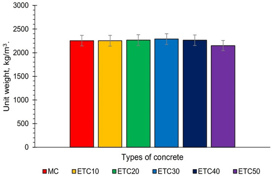 Figure 7 presents the unit weight results of the six study mixtures. There was minimal variation between the MC mixture and the ETC mixtures, and all of the unit weight values were within the specifications for the use of concrete in structural elements of civil works according to the NMX-C-155-ONNCCE-2014 standard, which indicates that hydraulic concretes for structural use must have a normal unit weight in fresh condition between 1900 kg/m3 and 2400 kg/m3 [67]. The lowest unit weight obtained was that of the ETC-50 mixture with 2149 kg/m3, with a decrease of 5% compared to the unit mass of the MC mixture; the highest unit weight was presented by the ETC-30 mixture with a value of 2288 kg/m3, 1.5% higher than the control mix. Khawaja et al. who evaluated concrete with Portland cement substitution in 5, 10, 15, 20, and 25% by SCBA, recorded an increase in unit weight of 3.13%, associated with the adhesive property of particles which reduced the concentration of induced air bubbles and consequently generated a stiffer matrix [68].