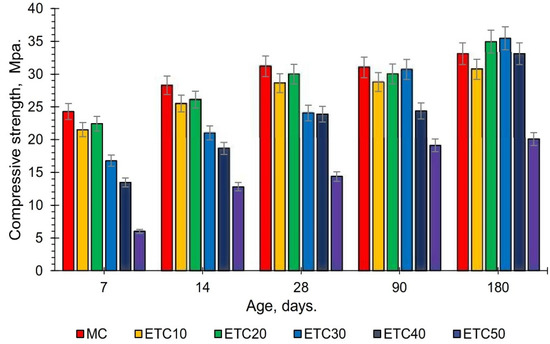 Figure 8 shows the compressive strength results of each of the mixtures, which were tested at the ages of 7, 14, 28, 90 and 180 days. After 7 days, the concrete ETC hadlower compressive strength values than the control mixture, of 11.32, 7.66, 30.92, 44.55 and 75.31% respectively for the ETC-10, ETC-20, ETC-30, ETC-40 and ETC-50 mixtures; this negative effect was due to the presence of alternative pozzolanic materials to cement SCBA and SF, and is in agreement with Wu et al., who showed that FA had a negative effect on strength at early ages, but significantly enhanced the later-age strength [69]. In other studies a similar behavior has been shown even when the specimens of concrete were exposed to an aggressive medium such as sulfates [70]. At 14 days, increases in the resistance of the ETC concretes were observed, and this increase in compressive strength over time continued to 28 days, when the ETC-10 and ETC-20 concretes had 90% of the compressive strength values of the MC, with values of 28 and 29 MPa respectively, while for the ETC-30 and ETC-40 concretes the values were 22 and 23 MPa, and the ETC-50 mixture presenting the lowest compressive strength value with 13 MPa. These compressive strength values in the first 28 days coincide with the findings of various studies, where it has been shown that at 28 days sustainable or ecological concretes that substitute 20% of the CPC with supplementary materials obtain the best performance in compressive strength testing, as demonstrated by Mohamed [71], who found that a ternary concrete mixture made with the substitution of 10% FA + 10% silica fume for Portland Cement presented the highest resistance to compression in a study that covered substitutions from 10% to 50% of fly ash and silica fume for the fabrication of ternary and binary concretes exposed to different types of curing. Arif et al. found that sugar cane bagasse ash used as filler in concretes provided substantial improvements to compressive strength at substitution percentages of up to ≈20% [72]. In other studies, it has been shown that concretes with high FA contents—30%, 40% or higher—presented higher compressive strength values than the control mix, but this was due to the use of superfluidifiers and concretes with a low w/c ratio, equal to or less than 0.40 [73,74].