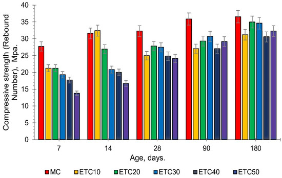 Figure 9 shows the results obtained from the rebound number tests to determine the compressive strength. It can be seen that the values obtained for the MC are similar to those presented in Figure 8: at the age of 28 days the control had an approximate value of 33 MPa for both simple compressive strength and rebound number tests. In the 7 day test, the ETC concretes reported compressive strength values lower than the MC by higher percentages than those reported in Figure 8, while over time these values increased in the five ETC mixtures, with this behavior likely being due to the effect of using materials with pozzolanic characteristics such as SCBA and SF. Unlike the compressive strength test using the cylinder, the values reported using the sclerometer for the five ETC concrete mixtures at the ages of 28, 90 and 180 days were always lower for the five ETC mixtures than for the MC; however, the mixtures with the best performances were still ETC20 and ETC30, which confirms the behavior in the compression test reported in Figure 8, where it was shown ETC20 and ETC30 were the best ETC mixtures at 90 and 180 days. The results obtained with the non-destructive rebound number test coincide with those reported in the literature on the use of said test to approximate the mechanical resistance of concrete elements in situ or in the laboratory, as reference values of resistance which must be supported by compressive strength tests of the evaluated concretes [78,79].